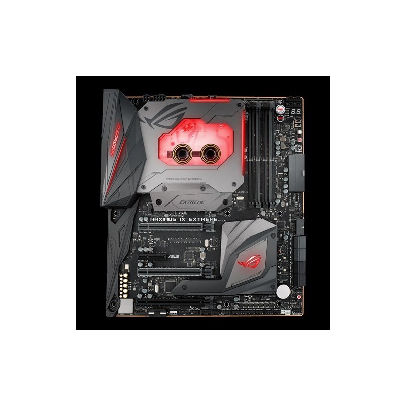 ASUS MAXIMUS IX EXTREME. tipos de memoria compatibles: DDR4-SDRAM, Tipo de ranuras de memoria: DIMM, Velocidades de reloj de memoria soportadas: 2400,2666,3400,3466,3500,3600,3733,3800,3866,4000,4133 MHz. Familia de procesador: Intel, Procesador compatible: Celeron,Core i3,Core i5,Core i7,Pentium, Socket de procesador: LGA1151. Controlador LAN: Intel I219-V, Wi-Fi estándares: IEEE 802.11a,IEEE 802.11ac,IEEE 802.11b,IEEE 802.11g,IEEE 802.11n. Componente para: PC, Familia de componentes de tarjeta madre: Intel, Circuito integrado de tarjeta madre: Intel Z270. Memoria máxima de adaptador de gráficos: 1024 MB, Soporte para proceso paralelo: 2-Way SLI,3-Way CrossFireX, Máxima resolución: 4096 x 2304 Pixeles