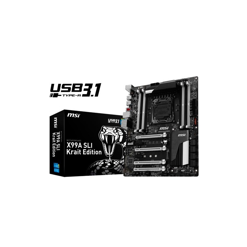 MSI X99A SLI Krait Edition. tipos de memoria compatibles: DDR4-SDRAM, Tipo de ranuras de memoria: DIMM, Canales de memoria: Cuadrángulo. Familia de procesador: Intel, Procesador compatible: Core i7 Extreme Edition, Socket de procesador: LGA 2011-v3. Interfaces de unidad de disco duro soportadas: M.2, Serial ATA III. Controlador LAN: Intel I210AT, Tipo de interfaz ethernet: Gigabit. Componente para: PC, Familia de componentes de tarjeta madre: Intel, Circuito integrado de tarjeta madre: Intel X99