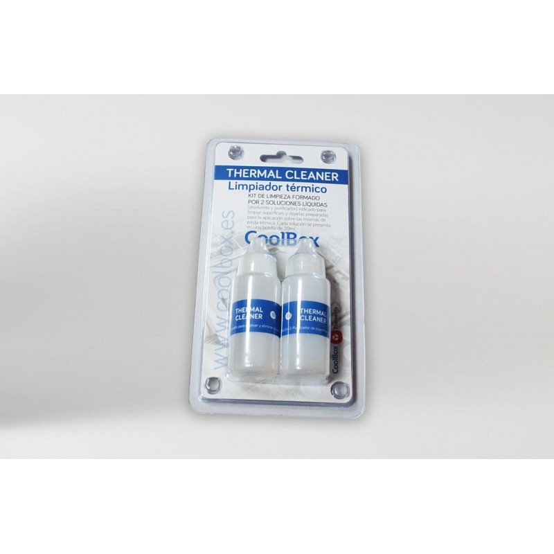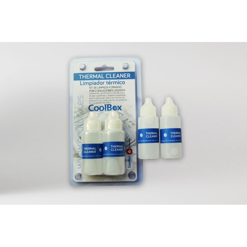 Kit de limpieza de pasta térmica formado por 2 soluciones líquidas (disolvente y purificador) indicado para limpiar superficies y dejarlas preparadas para la aplicación sobre las mismas de pasta térmica. Cada solución se presenta en una botella de 30ml.