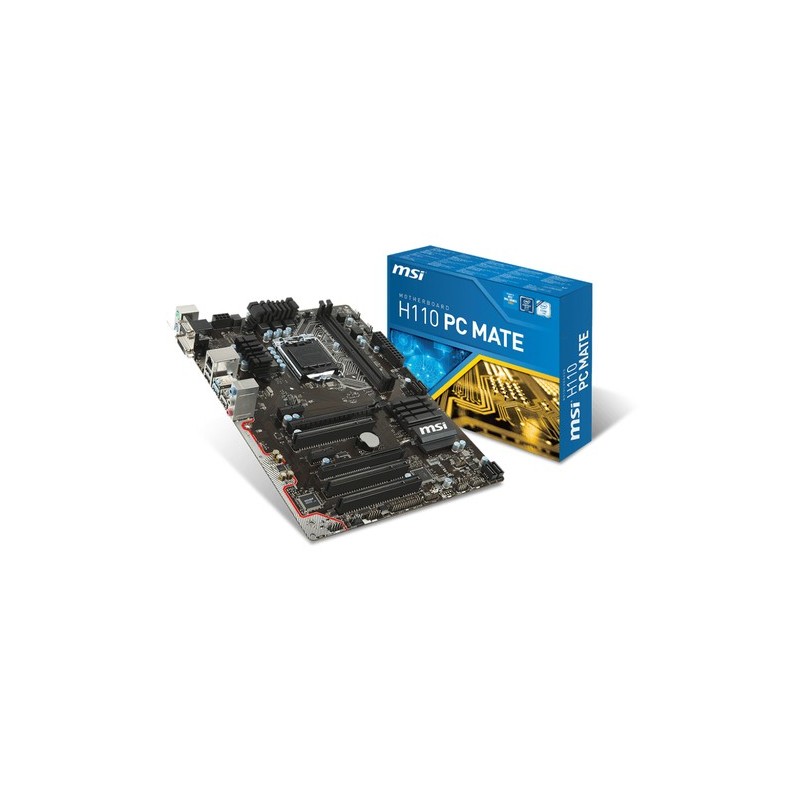 MSI H110 PC MATE. tipos de memoria compatibles: DDR4-SDRAM, Tipo de ranuras de memoria: DIMM, Canales de memoria: Dual. Familia de procesador: Intel, Procesador compatible: Celeron, Core i3, Core i5, Core i7, Pentium, Socket de procesador: LGA1151. Interfaces de unidad de disco duro soportadas: Serial ATA III. Controlador LAN: Realtek RTL8111H, Tipo de interfaz ethernet: Fast Ethernet, Gigabit Ethernet. Componente para: PC, Familia de componentes de tarjeta madre: Intel, Circuito integrado de tarjeta madre: Intel H110
