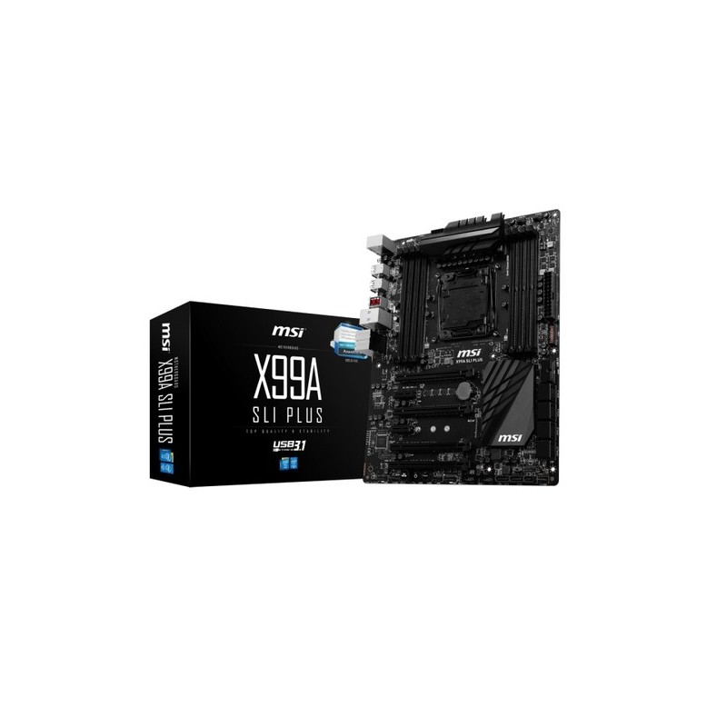 MSI X99A SLI PLUS. tipos de memoria compatibles: DDR4-SDRAM, Tipo de ranuras de memoria: DIMM, Canales de memoria: Cuadrángulo. Familia de procesador: Intel, Procesador compatible: Core i7 Extreme Edition, Socket de procesador: LGA 2011-v3. Interfaces de unidad de disco duro soportadas: M.2, Serial ATA III. Controlador LAN: Intel I218, Tipo de interfaz ethernet: Gigabit. Componente para: PC, Familia de componentes de tarjeta madre: Intel, Circuito integrado de tarjeta madre: Intel X99