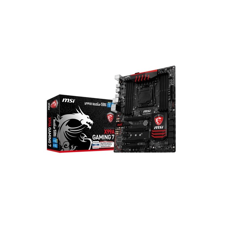 MSI X99A GAMING 7. tipos de memoria compatibles: DDR4-SDRAM, Tipo de ranuras de memoria: DIMM, Canales de memoria: Cuadrángulo. Familia de procesador: Intel, Procesador compatible: Core i7 Extreme Edition, Socket de procesador: LGA 2011-v3. Interfaces de unidad de disco duro soportadas: M.2, Serial ATA III. Controlador LAN: Bigfoot Killer E2205, Tipo de interfaz ethernet: Gigabit. Componente para: PC, Familia de componentes de tarjeta madre: Intel, Circuito integrado de tarjeta madre: Intel X99