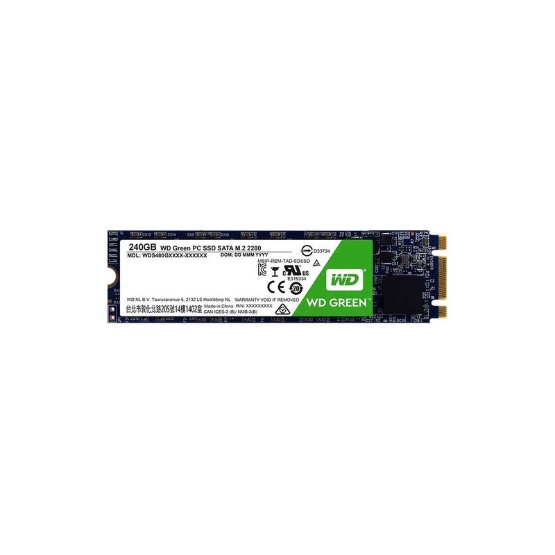 Western Digital Green. Disco de estado sólido, capacidad: 240 GB, Interfaces de disco de estado sólido: Serial ATA III, Velocidad de lectura: 540 MB/s. Factor de forma de disco SSD: M.2, Certificación: FCC, UL, TUV, KC, BSMI, VCCI. Ancho: 80 mm, Profundidad: 22 mm, Altura: 1,5 mm