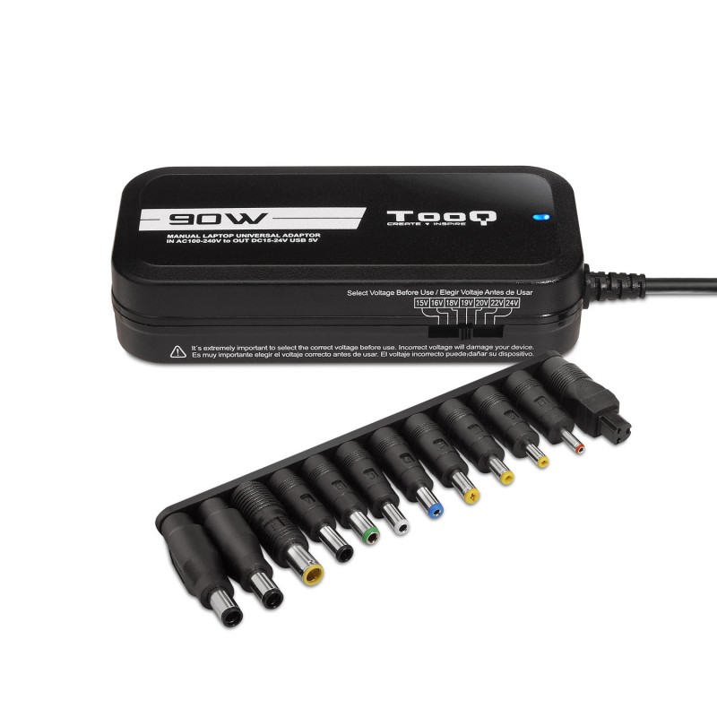 - Cargador universal multi tensión para portátiles y otros dispositivos que permite utilizarse en casa.