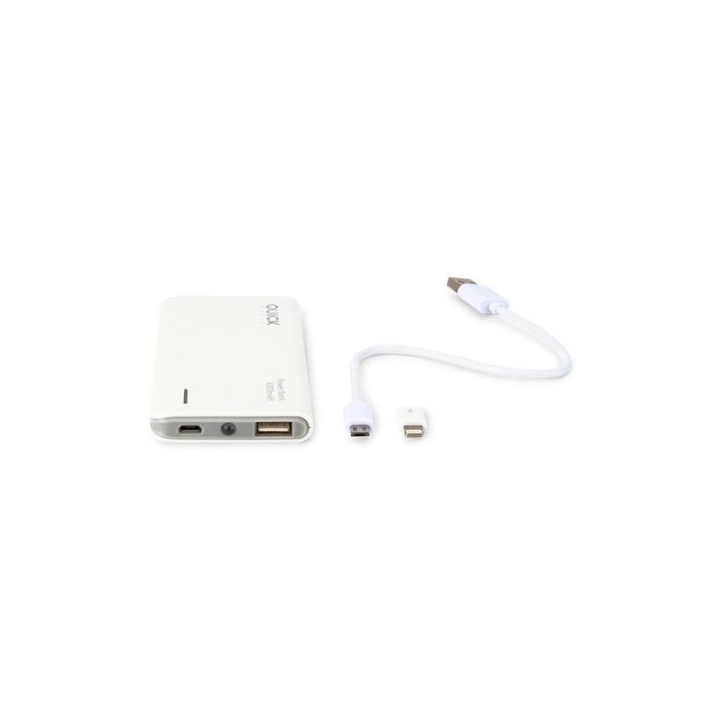 Quick Media PB40. Color del producto: Color blanco, Compatibilidad del cargador: Universal. TecnologÃa de baterÃa: PolÃmero de litio, Capacidad de baterÃa: 4000 mAh, Fuente de carga: USB. Peso: 120 g. Cables incluidos: Lightning, Adaptadores incluidos: Micro-USB A