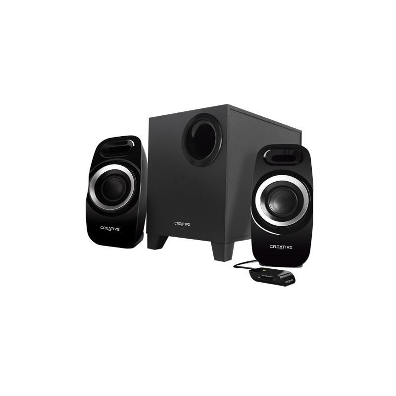 Creative Labs INSPIRE T3300. Canales de salida de audio: 2.1, Potencia estimada RMS: 27 W, Uso recomendado: PC. Relación señal/ruido (SNR): 75 dB. Tipo de bocina satelital: De 2 vías, Potencia RMS de altavoces satélite: 5,5 W, Rango de frecuencias de altavoz satélite: 40 - 20000 Hz. Potencia RMS de subwoofer: 16 W. Fuente de energía: Corriente alterna